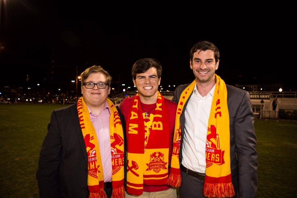 (The Magic City Brigade founder Forrest Collins (center) with Birmingham Hammers co-founders Morgan Copes (right) and John Killian (left))